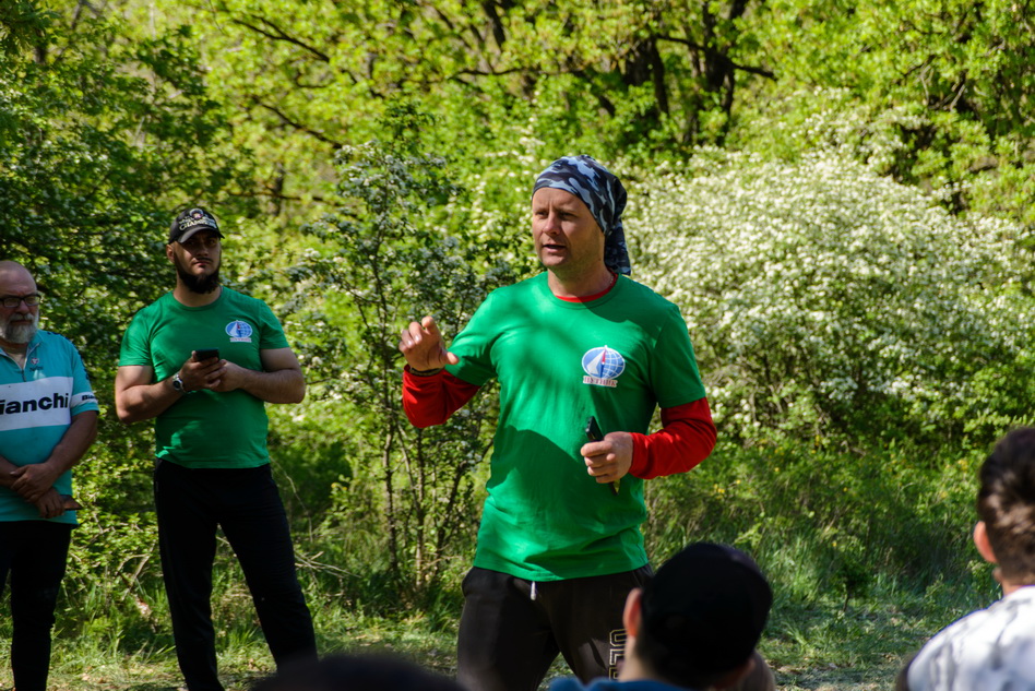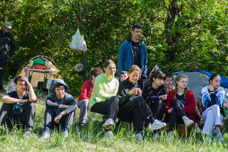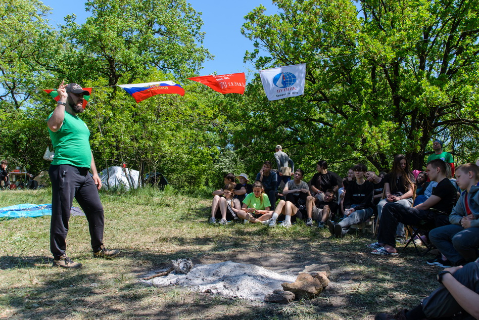 К этому времени подтянулись остальные команды. Они устанавливали свои палатки, готовили ужин. Туристов было очень много, но все были разбиты по своим лагерям, как войска перед битвой. И уже на общем построении все собрались на поляне под флагами Приднестровья, России, Знаменем Победы и походным флагом ЭКТ «Путник». Начальник слёта Президент Федерации спортивного туризма Приднестровья Виктор Трофименко поздравил всех присутствующих с 80-й годовщиной Победы в Великой Отечественной войне и объявил об открытии слёта. Почтили минутой молчания погибших в той страшной войне. Заведующий учебной частью Алексей Батрынча довёл до сведения участников слёта порядок и условия проводимого мероприятия. После построения представители (руководители делегаций) собрались на рабочее совещание. А после ужина все подтянулись к общему костру – пели под гитару, общались, делились впечатлениями. Формально отбой был объявлен на 23 часа, но… туристские байки так сразу не заканчиваются!