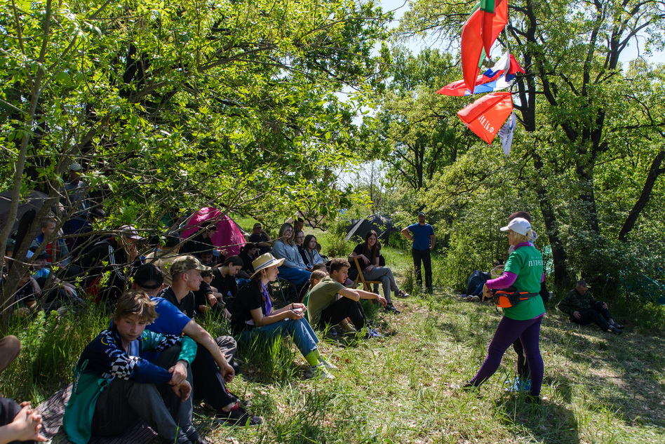 Первыми на место приехали, как и полагается, организаторы – туристы экскурсионно-туристического клуба «Путник». Организовали палаточный лагерь, подготовили проход к оврагу, организовали «перила» к роднику, журчащему на дне оврага, расчистили от мусора и запрудили родник, чтобы у участников слёта была возможность набирать воду. Над оврагом (и внутри него) натянули трассу. Выглядело это эпично, как в фильме про спецназ, только вместо врагов – ветки и комары.