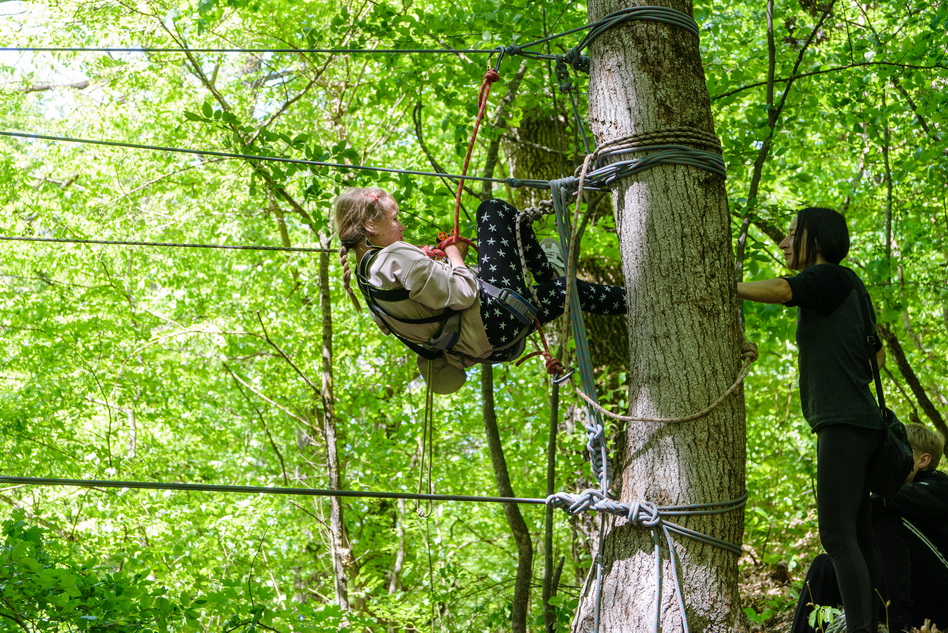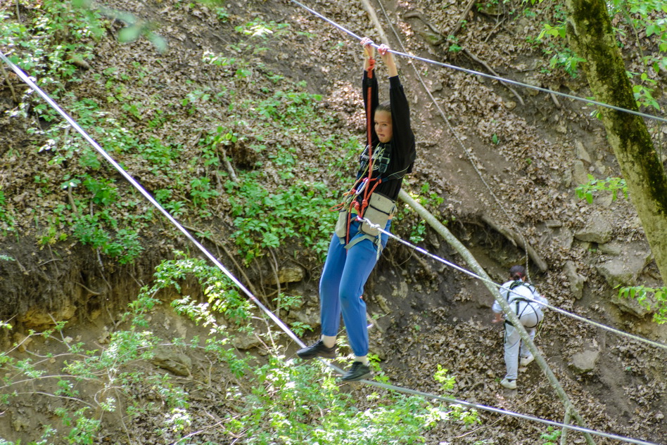 После обеда – практика. По наведённым накануне переправам перебирались с одного берега оврага на другой, спускались в овраг и поднимались по его склонам. Испытывали себя на физическую прочность, на моральную силу, на поддержку и страховку товарищей по команде. Не у всех получилось пройти с первого раза, но никто ни над кем не насмехался. В воздухе витал дух поддержки, доброжелательства, дружбы. Инструкторы-волонтёры из команды «Молния», организаторы Слёта всеми силами помогали участникам, следили за правильностью и безопасностью работ на верёвках, но не уходили со своих этапов до последнего спортсмена.