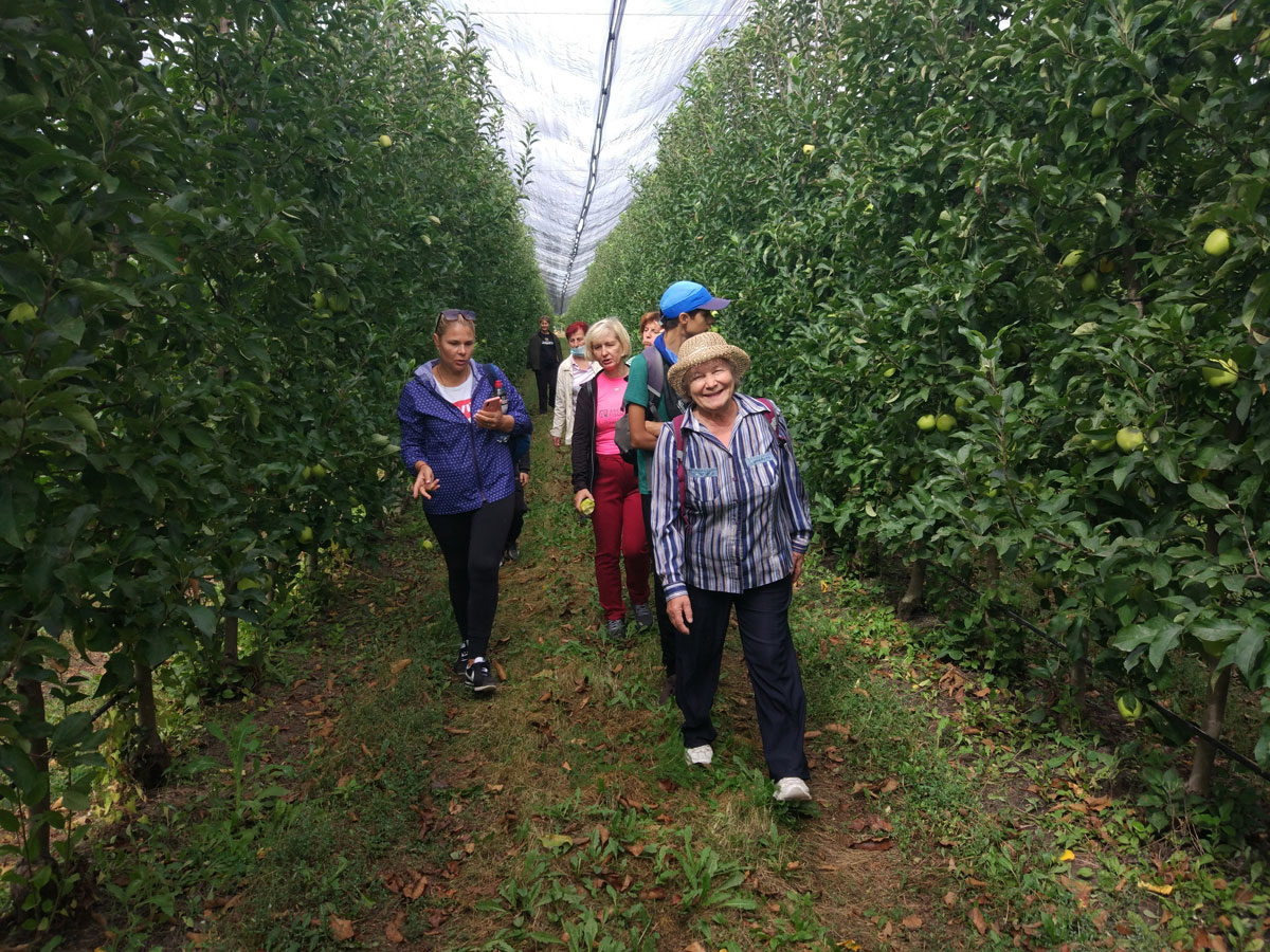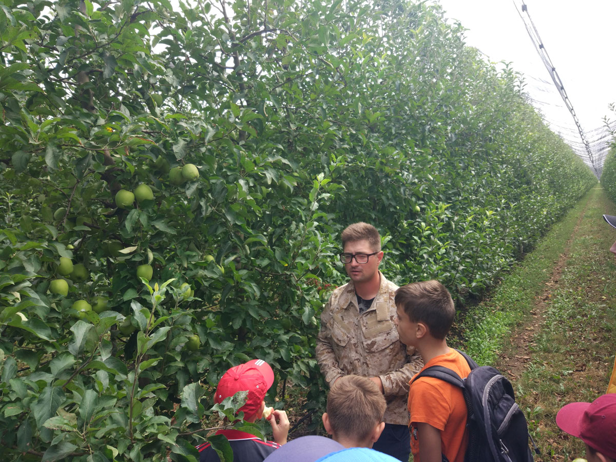 Экскурсанты узнали о том, как выращивают фрукты. Так, например, происходит каждый год обрезка деревьев, чтобы молодые ветки не мешали собирать урожай. Над рядами протянута специальная сетка (АГС – Анти-градовая сетка), которая защищает сад от порчи птицами, дождем, градом, снегом, солнцем. Урожай на самом деле хороший, и ребятам посчастливилось попробовать на вкус разные сорта яблок, персиков, нашли даже абрикосы и сами собрали немного земляники. Всё было очень вкусно!