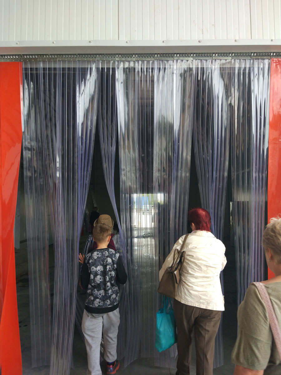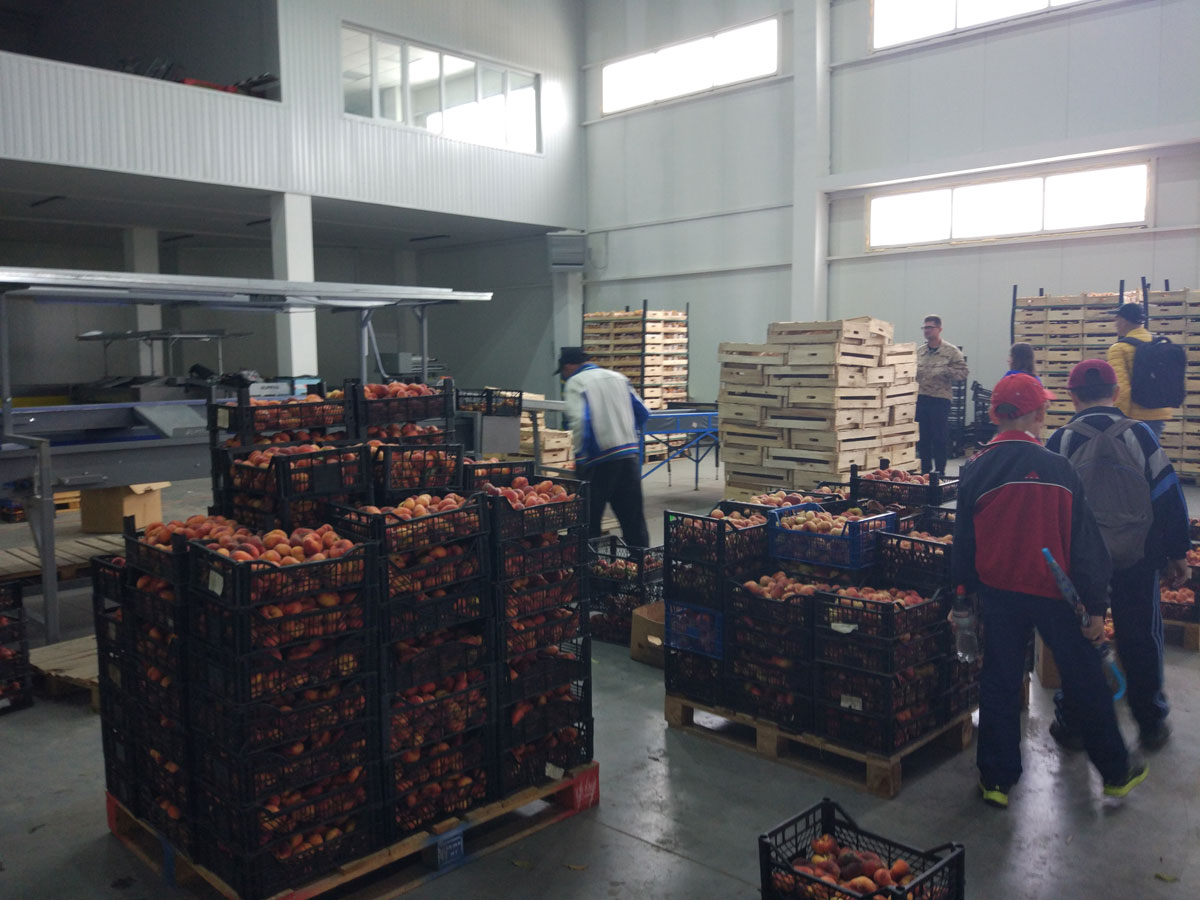 Ещё были в холодильном складе (фруктохранилище), где фрукты хранятся при температуре, стремящейся к нулю. Сначала происходит перебор фруктов, потом их оставляют в предварительно охлажденном помещении, после которого фрукты переводят в холодильники. Тут экскурсовод угостил гостей вкусными персиками нового вида.