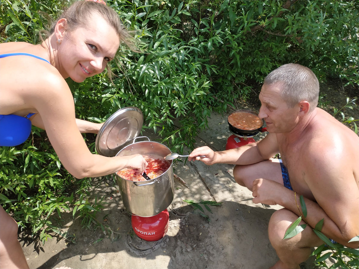 А какой же был у нас ужин! Жареное на углях мясо, и ароматная рыбацкая уха из свежайшей рыбы, приобретенной по случаю у местных рыбаков. Вкусностей было столько, что еще пол ночи ели, еду запивали чаем, чай запевали песнями, песни разбавляли играми. Улеглись опять около 2-х часов ночи.