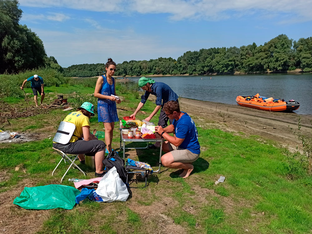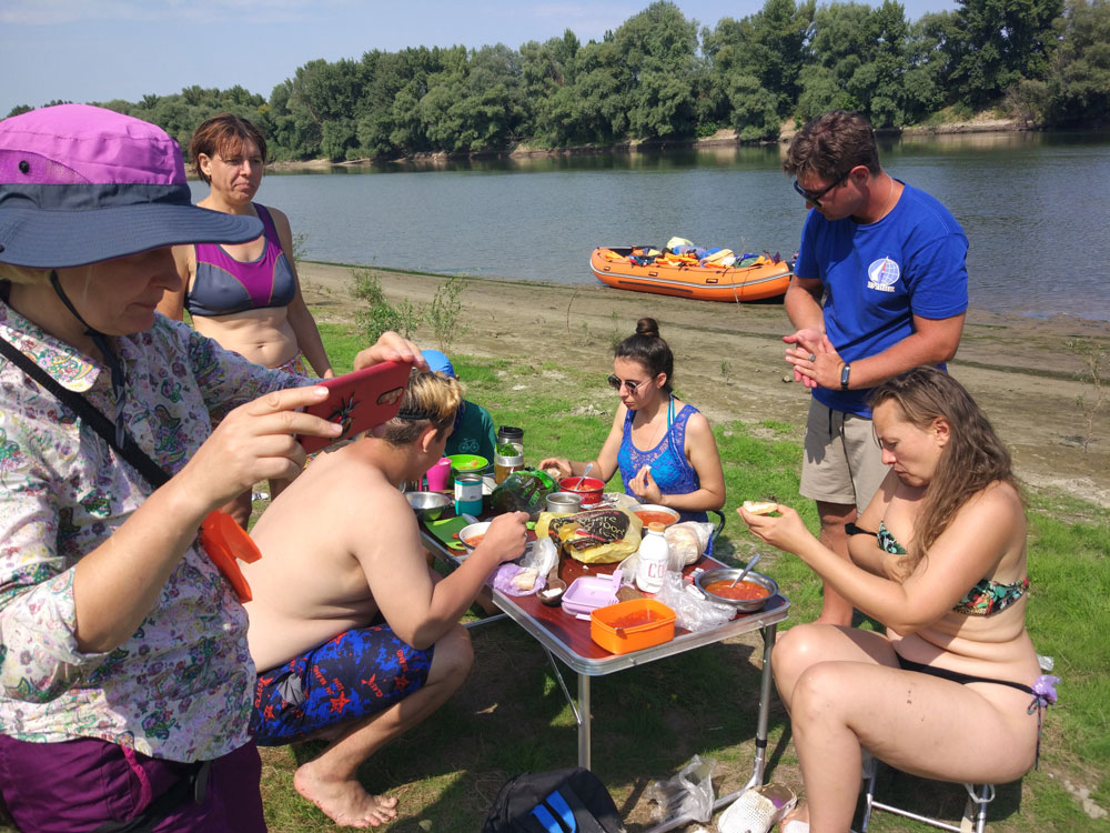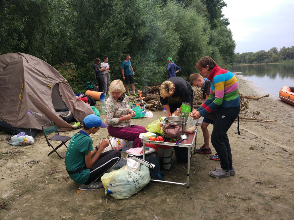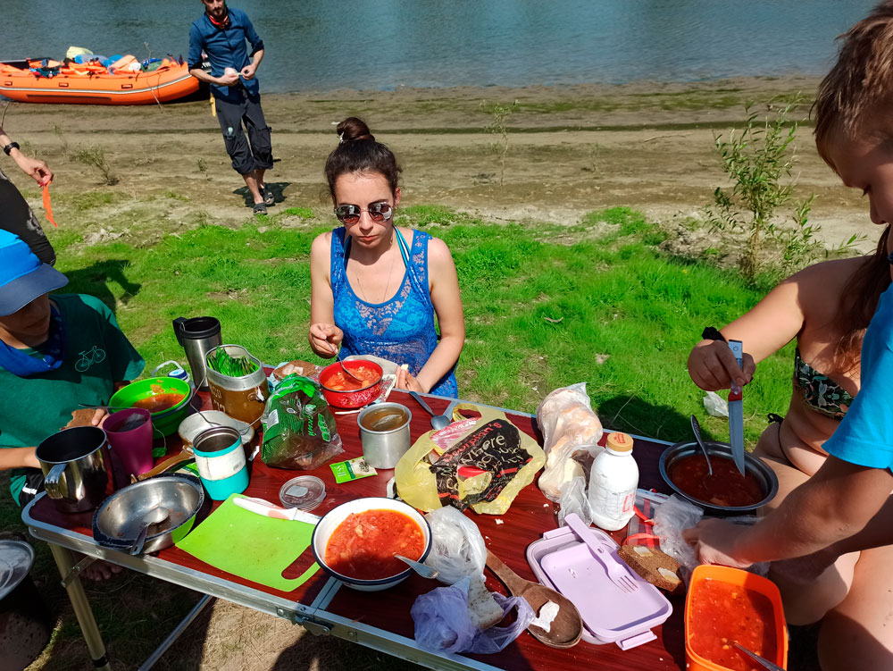 Причалили к правому берегу на обеденный привал. Два с половиной часа на обед и отдых, купались, многие успели вздремнуть. На месте обеденного привала был прекрасный пляж, мелководье далеко, достигало почти середины Днестра. Пляж весь зарос кустарником, дрова были (недалеко лесопосадка и было ветровальное сухое дерево). Очень выручила большая «печка», найденная на берегу. На обед дежурные приготовили очень вкусный борщ, к нему были сало, чеснок. Пили чай с сушками.