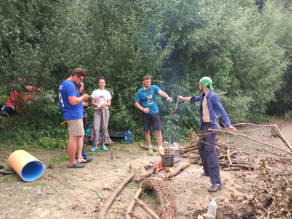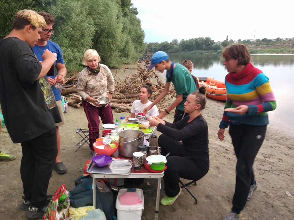 Затем мы переправились на противоположный берег (пляж лагеря «Олимпиец») с песчаным пляжем и начали обустраивать лагерь и готовить ужин (гречка с тушенкой, салат из огурцов и помидоров, разный чай, пряники). Ужинали уже в темноте.