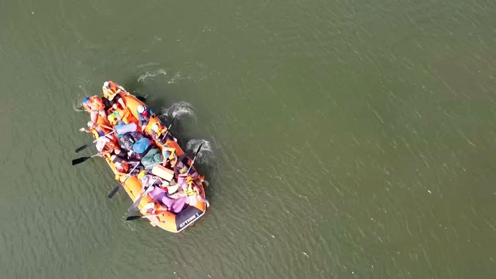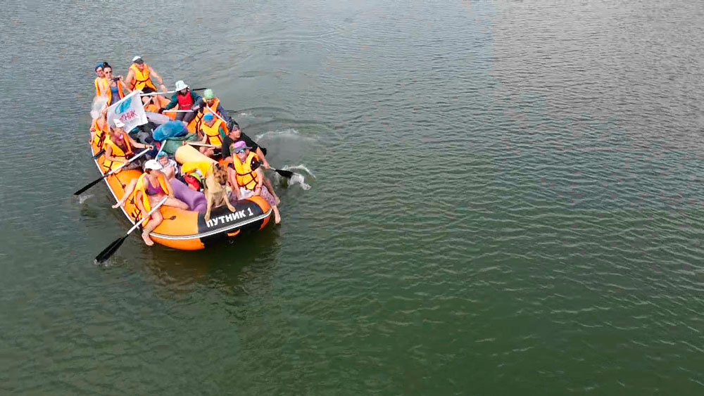Вначале шли со средней скоростью 6 км/ч, свежие силы и хорошее течение реки помогали. Через полтора часа гребли сделали перерыв на 15 минут, перекусили вафлями и конфетами, затем гребли ещё до Карагашского пляжа, где сделали привал на перерыв. Набрали в фляги воды в церкви в Карагаше (она недалеко от берега). После отбытия от Карагашского пляжа наблюдали дрон, а хозяева дрона с правого берега наблюдали за нами. Причалили, пообщались. Хозяин дрона впоследствии любезно выслан нам фото и видео с коптера.