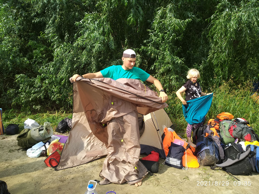До места ночлега гребли чуть больше 2 часов. Скорость нашего хода снизилась до 4,5 км/ч. Пристали на ночевку напротив Слободзеи, на правом берегу, недалеко от парома, на изгибе (правый поворот) реки. Место ночевки – сырой пляж, почти весь заросший кустарником. Две палатки, костёр и стол поставили на пляже. Три палатки – в леске, рядом же. Соседи-рыбаки – за кустами.