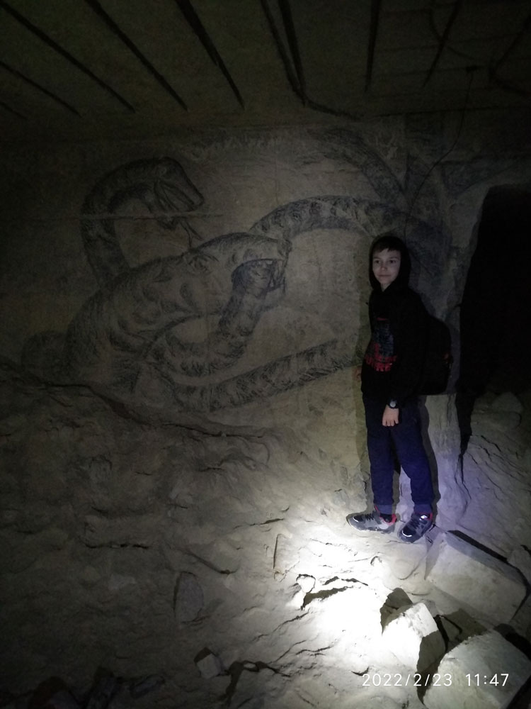 На одной из стен штолен была обнаружена скальная живопись в виде дракона с тремя головами, возле которой все стали фотографироваться. И только часа через полтора туристы вышли из подземелий.