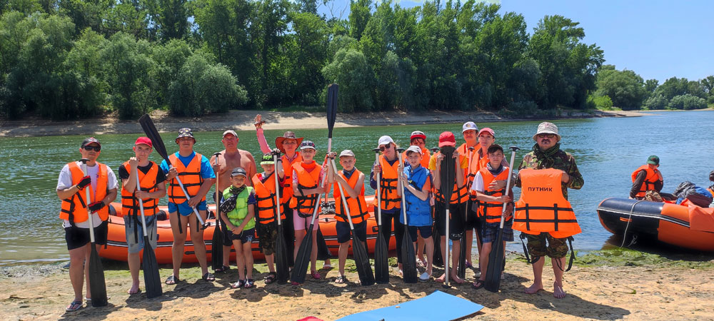 Сделали общую стартовую фотографию и в путь. Учитывая, что подавляющее большинство находилось в рафте впервые (а некоторые не имели вообще никакого опыта водных походов – даже в байдарках не сидели), то по началу движение вперёд осуществлялось исключительно благодаря течению. Особенно это относилось к экипажу «Путник 2». Действия людей с вёслами скорее мешали, заставляя рафт постоянно «вальсировать». Но до парома более-менее гребцы скоординировали свои действия, выровняли движение рафтов и аккуратно прошли паром. Затем экипаж «Путник 1» подождал «Путник 2», пришвартовались друг к другу. Потом шли рядом. Рафты всё более подчинялись своим экипажам.