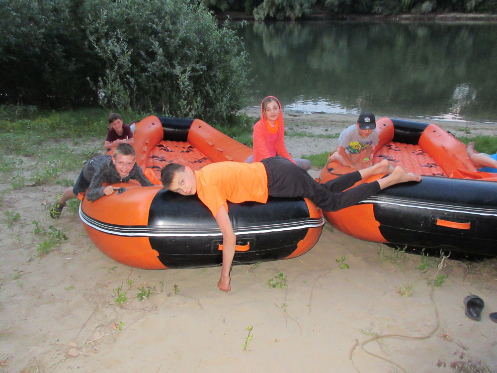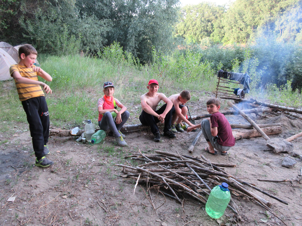 По окончании небольшого послеобеденного отдыха экспедиция примерно на час стала сухопутной: всё снаряжение, включая оба плавсредства, необходимо было перенести выше по течению. Надели рюкзаки, собрали спасжилеты и вёсла, взялись за ручки своих «лодочек» и – вперёд! По второй просеке (примерно 1,3 км) пересекли Кицканский лес на запад. Через крапиву, сквозь тополиный пух, постоянно отгибая ветки вдоль оказавшейся узкой просеки… Ещё бы! Ширина просеки – одна автомобильная колея (примерно 2 метра). И та заросла и перестала быть прямой. А ширина рафта – 2,35… Да ещё плюс по одному человеку с каждой стороны. Но оба экипажа справились! Перенесли снаряжение, погрузились на рафты, пересекли реку и чуть ниже по течению причалили на дикий пляж на левом берегу Днестра. Движение на первый день окончено: разбиваем палаточный городок, ужинаем, отдыхаем у костра. Отбой по желанию, дежурство – согласно договорённостей между собой.