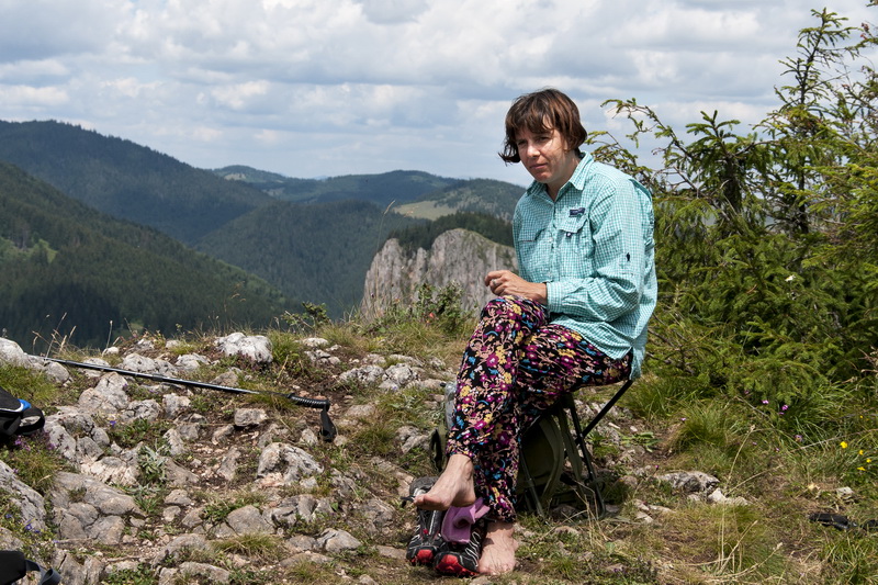 На вершине, откуда открывался замечательный вид, установлена смотровая площадка, поэтому мы смогли приблизить величественные скалы на длину вытянутой руки. Пока мы любовались ландшафтом, завхоз с помощниками подготовили перекус. Коронное блюдо – рыбные консервы с луком и майонезом. Ещё были бутерброды с паштетом и двумя видами колбасы. Поели, отдохнули, фотографировались. И пошли в обратный путь.