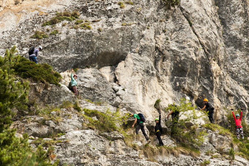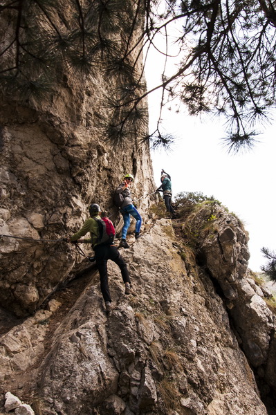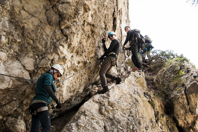 Сначала шли траверсом, но это было только начало. Было страшновато – ведь длинна трассы на подъём составляет 250 м! От страха новички не выпускали трос из рук. Потом после точки невозврата, когда пути назад уже нет, а есть только дорога вперёд, более того – только вверх, начался самый сложный участок пути.