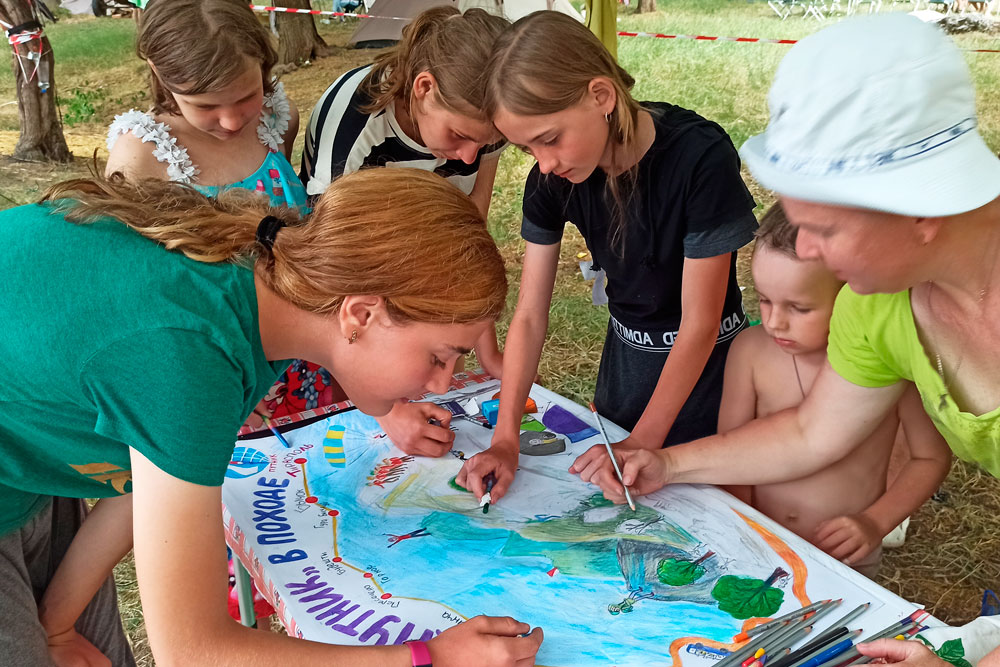 На следующий день после завтрака ребята отправились собирать ягоды для компота: дикую черешню и шелковицу. Компот был очень вкусный. Потом рисовали плакат и результат поразил всех! Каждый из взрослых тоже приложил свою руку.