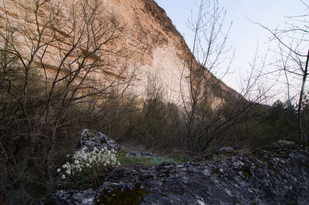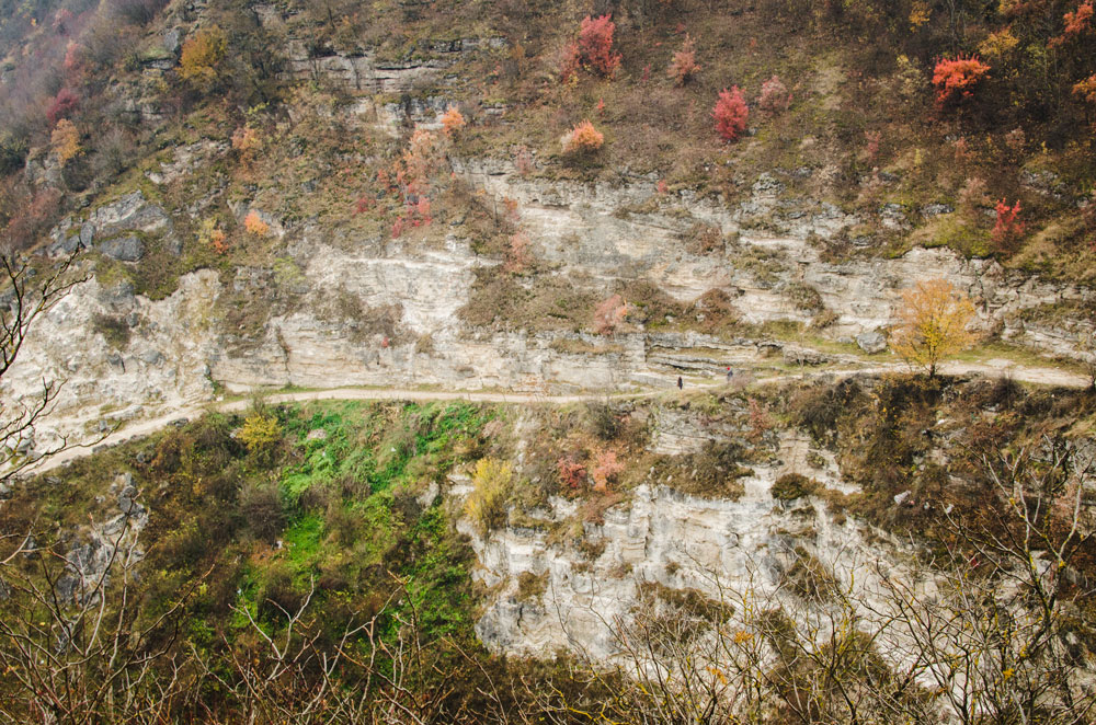 Поднимаясь по тропинке к провалу, проходишь мимо причудливых скульптурных групп, выдолбленных в известняке ветрами и водой: головы верблюдов, сфинксы, грибы, столы обступают узкую тропу. Выше этих образований виден естественный висячий мост. Это слой плотных известняков, под которым подземные воды растворили и вымыли большой туннель.